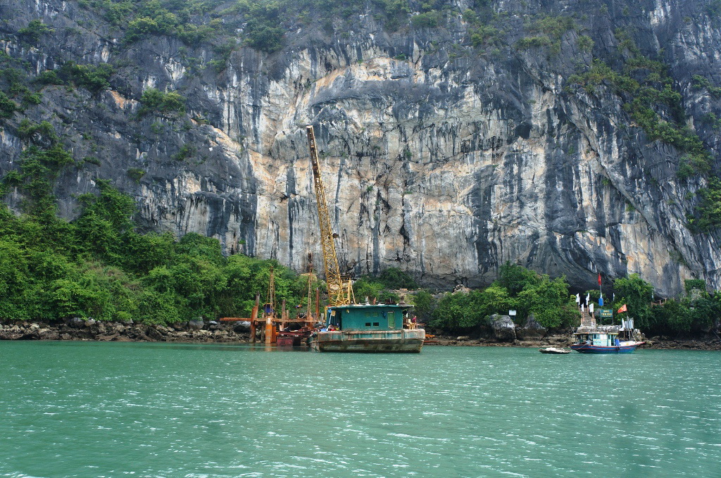 Hoạt động xây dựng bến cập tàu tại động Mê Cung thuộc vịnh Hạ Long Ảnh: QUỐC HÙNG