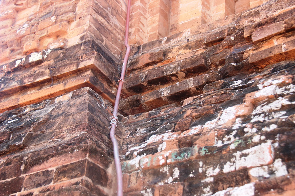 Sau vụ việc lắp biển quảng cáo, chúng tôi trở lại với di tích kiến trúc nghệ thuật quốc gia đặc biệt tháp Nhạn (thuộc núi Nhạn, phường 1, TP Tuy Hòa, Phú Yên). Khi đến gần, chúng tôi thấy khá bất ngờ bởi di tích này đang trong tình trạng xuống cấp và bị xâm hại nghiêm trọng nặng. “Mục sở thị” quanh khu tháp này chúng tôi nhận thấy có rất nhiều viên gạch trên tháp đã bị bào mòn, thậm chí bị mục nát. Điều đáng nói, nhiều điểm trên bề mặt tháp bị khoan đục nhiều nơi, bắt vít sắt, ốc sắt, đinh sắt chi chít, trông rất phản cảm. Một số điểm trên tháp còn bị đục những lỗ rất lớn, bắt những thanh sắt đã han rỉ lòi ra ngoài mặt tháp.