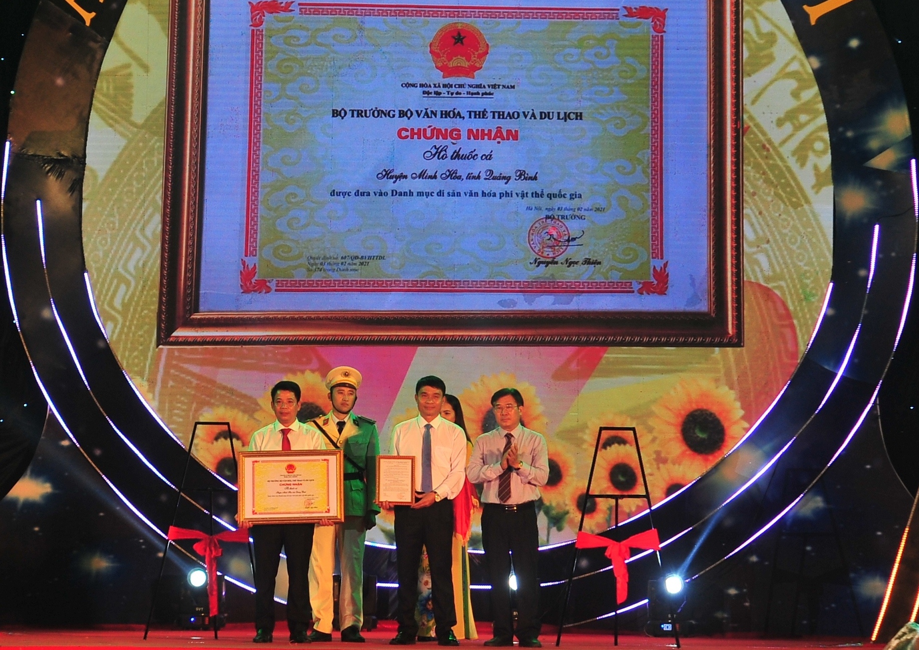 Tại buổi lễ, đại diện lãnh đạo Cục Di sản Văn hóa (Bộ Văn hóa, Thể thao và Du lịch) đã trao bằng chứng nhận Di sản văn hóa phi vật thể quốc gia “Nghệ thuật trình diễn dân gian, tri thức dân gian hò thuốc cá huyện Minh Hóa, tỉnh Quảng Bình”; đại diện lãnh đạo tỉnh Quảng Bình trao bằng công nhận di tích lịch sử cấp tỉnh đối với “Căn cứ kháng chiến của vua Hàm Nghi” ở Minh Hóa cho nhân dân và cán bộ huyện Minh Hóa.