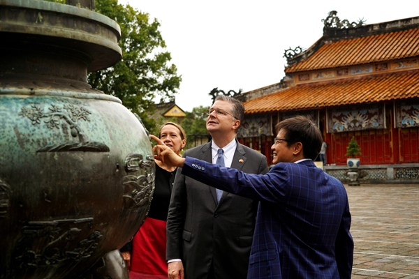 Tác giả giới thiệu với du khách về sự độc đáo hiếm có của Cửu đỉnh