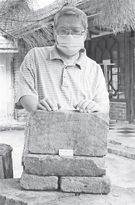 Ông Võ Đình Viên (xã An Phú, TP. Pleiku, Gia Lai) bên những viên gạch cổ được cho liên quan đến dấu tích đền, tháp cổ Champa ở Gia Lai