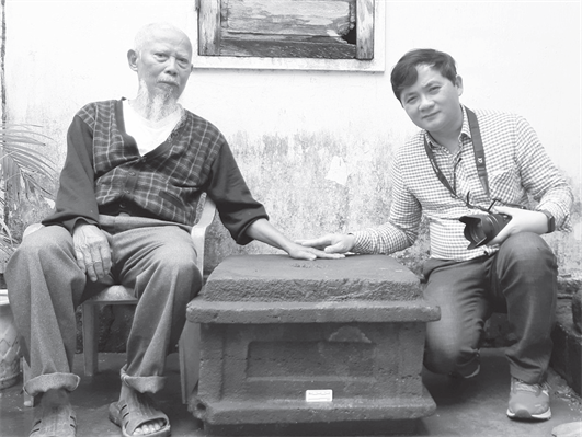 Ông Nguyễn Công Hòe (trái) cùng ông Nguyễn Quang Tuệ bên cạnh khối đá sa thạch cổ