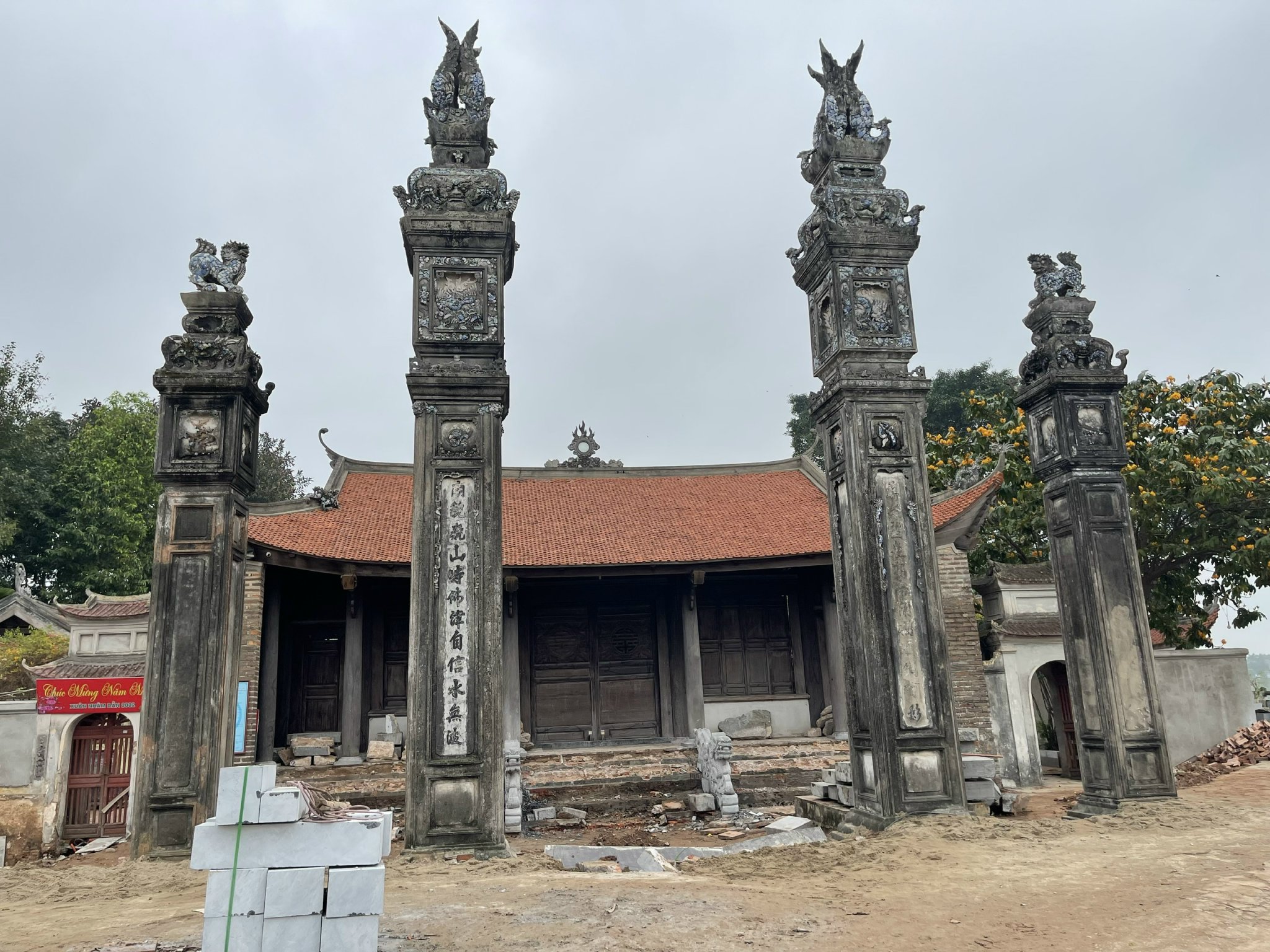 Ở nội dung 2, tại khu vực sân bia nằm cạnh tứ trụ phía ngoài cổng di tích đang xây dựng, móng được gia cố phía bên dưới của lan can đá bằng bê tông lót đá, bê tông cốt thép và đá nguyên khối xếp chồng lên nhau. Theo báo cáo tu sửa cấp thiết thì không thấy có nội dung gia cố móng tại vị trí này.