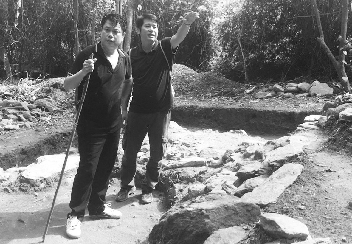 Anh Nguyễn Ngọc Chất, cán bộ Bảo tàng Lịch sử Quốc gia, chủ trì khai quật (bên phải) và Giám đốc Bảo tàng tỉnh Bắc Giang tại khu vực khai quật khảo cổ