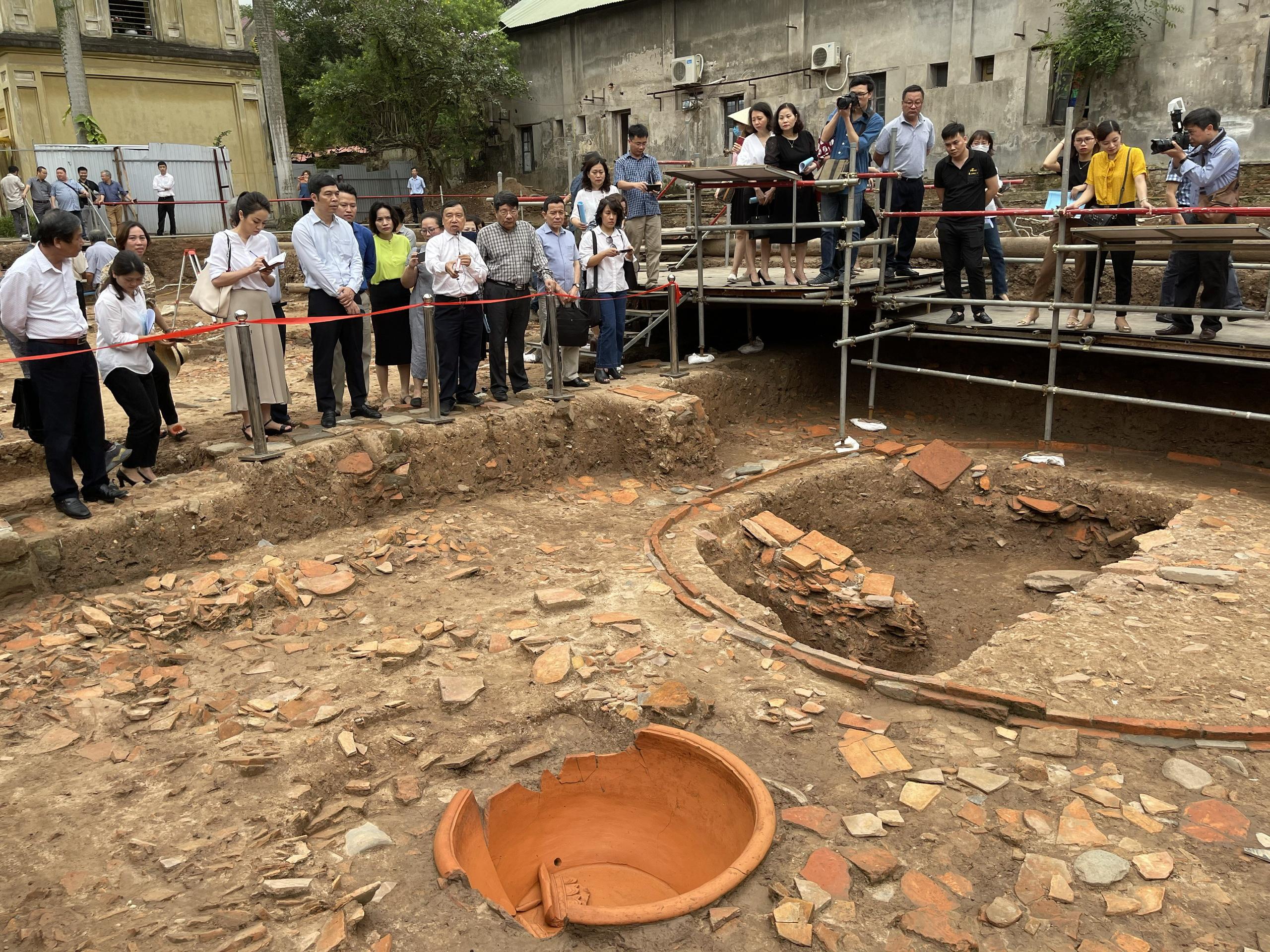 Nhiều chuyên gia, nhà nghiên cứu tham quan hố khai quật có dấu tích kiến trúc thời Trần