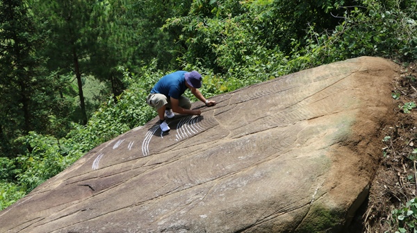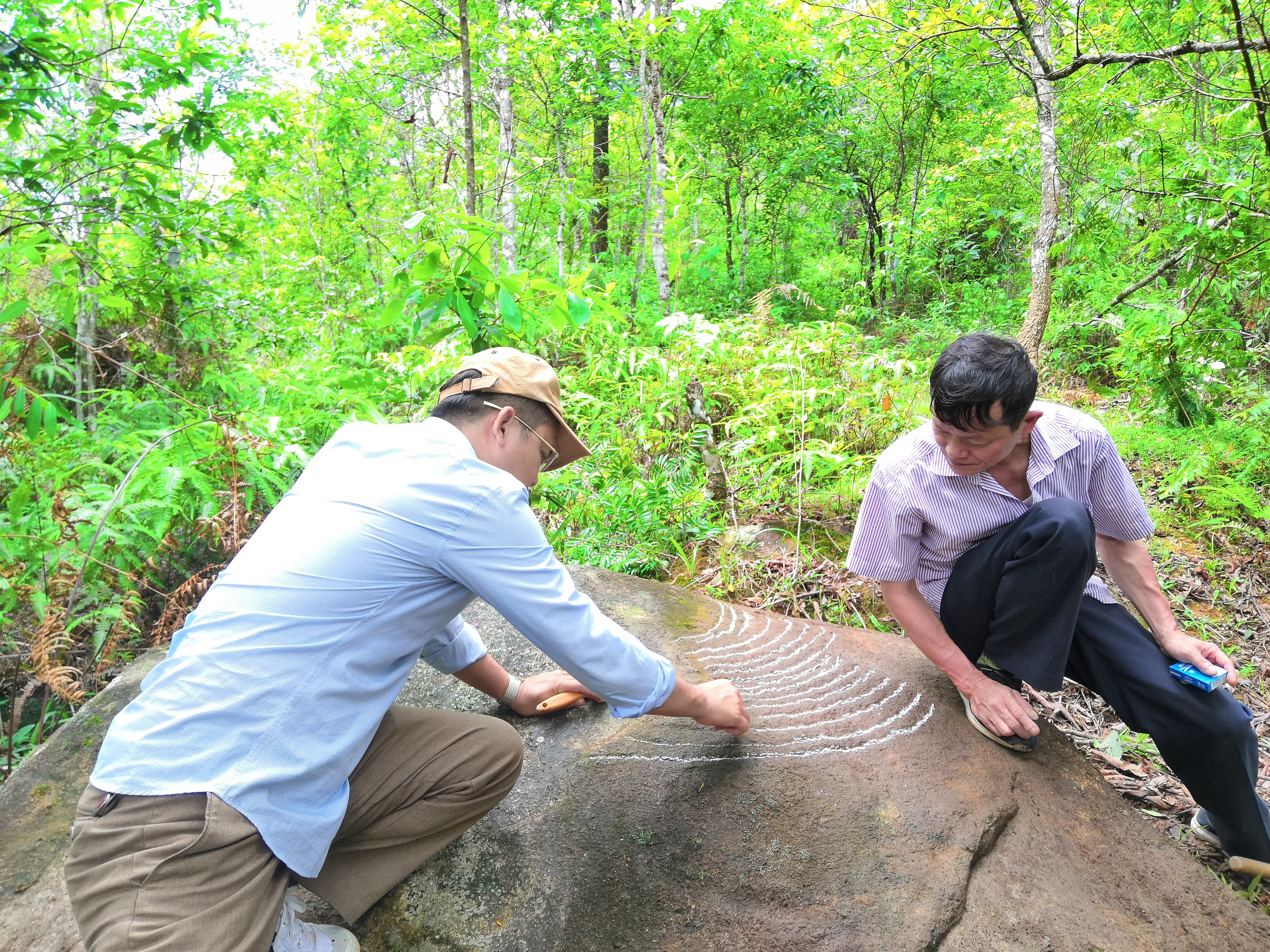 Nhóm cán bộ bảo tàng tỉnh Yên Bái vừa phát hiện nhiều khối đá khắc cổ với những hình ruộng bậc thang"có một không hai" Ảnh: NGUYÊN HÒA