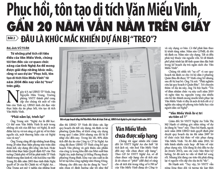 Bàn vào thực chất của dự án bị “ngâm” suốt gần 20 năm nay, ông Long cho hay, UBND tỉnh đã phê duyệt đầu tư dự án từ tháng 6.2014. Tháng 8.2014, tỉnh phê duyệt quy hoạch xây dựng. Chủ đầu tư lúc này được chuyển từ Sở VHTTDL (tên gọi trước khi tách Sở) sang UBND TP Vinh. Nhưng hiện tại TP Vinh chưa có báo cáo gì. “Sau khi đọc loạt bài phản ánh về dự án phục hồi di tích Văn Miếu Vinh trên Báo Văn Hoá, UBND tỉnh sẽ có công văn yêu cầu UBND TP Vinh báo cáo để biết rõ những “mắc mớ” khiến dự án bị chậm. Vấn đề là UBND tỉnh muốn biết đến từng chi tiết “mắc mớ” mới có dự kiến hướng xử lý cụ thể”, ông Long nói.