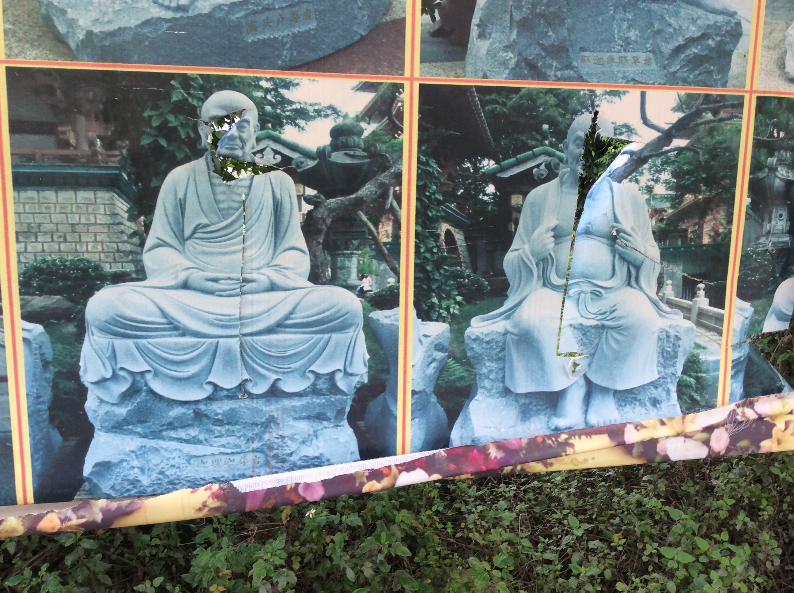 Nhận được thông tin từ người dân, sáng sớm ngày 6.4 chúng tôi đã nhanh chóng quay trở lại ngôi chùa này để nắm bắt sự việc mới xảy ra. Theo Đại đức Thích Thanh Khánh, vào sáng ngày 5.4 (tức ngày 1.3 âm lịch, ngày bà con phật tử thường hay lên chùa thắp hương) thì nhà chùa đã phát hiện rất nhiều tấm pano in hình ảnh các hoạt động của chùa ở hai bên lối vào chính đã bị rạch nhiều vết ngang theo hình ảnh. Đặc biệt hơn, hình ảnh các tượng La Hán thì đều bị rạch biến dạng phần đầu và kéo dọc xuống thân tượng. Quan sát trực tiếp, có thể thấy rõ những vết rạch, chọc thủng pano là có chủ đích và so khoảng cách từ mặt đất lên pano thì chắc chắn đối tượng gây ra là người lớn chứ không phải do trẻ em gây ra.