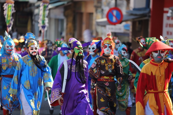 Các nghệ sĩ hóa trang thành nhân vật Tuồng tham gia đoàn rước quảng diễn đường phố