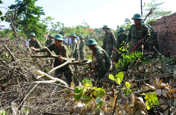 Các chiến sĩ của Bộ Chỉ huy Quân sự tỉnh Thừa Thiên Huế thu gom rác thải, xử lý cây xanh và cỏ dại ở di tích Thượng Thành