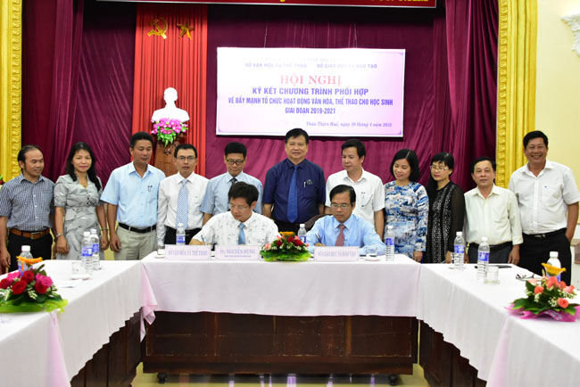 Ngoài ra, 2 Sở cũng sẽ tăng cường phối hợp tổ chức các hoạt động ngoại khóa cho học sinh tìm hiểu về các nội dung phòng, chống bạo lực gia đình; giáo dục đạo đức trong lối sống gia đình; phối hợp triển khai hoạt động tuyên truyền, nâng cao nhận thức trong học sinh về xây dựng nếp sống văn minh gắn với việc triển khai đề án Ngày Chủ nhật xanh, phong trào thi đua Nét đẹp văn hóa học đường, văn hóa giao thông, văn hóa ứng xử trong trường học. Ông Nguyễn Dung, Phó Chủ tịch UBND tỉnh Thừa Thiên Huế đề nghị Sở VHTT và Sở GD&ĐT cần hỗ trợ lẫn nhau trong công tác quản lý, giáo dục, chỉ đạo tổ chức các hoạt động về văn hóa, thể thao. Trong quá trình thực hiện, nếu có những khó khăn về kinh phí thì cần phải có văn bản trình UBND tỉnh xem xét bố trí. “Việc phối hợp đẩy mạnh các hoạt động về văn hóa, văn nghệ, thể thao trong trường học góp phần rèn luyện thể lực cho các em học sinh, đáp ứng nhu cầu vui chơi giải trí lành mạnh cho học sinh- sinh viên. Đồng thời góp phần phát hiện, đào tạo năng khiếu và tài năng về nghệ thuật, thể thao cho quê hương", ông Dung nhấn mạnh.