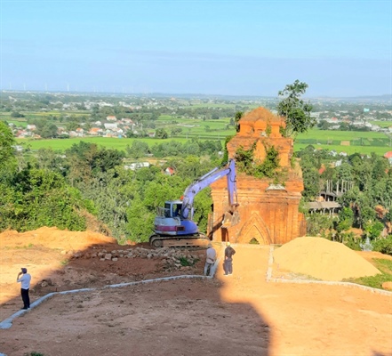 Mặc dù đã được Bộ VHTTDL có văn bản đồng ý thẩm định dự án, tuy vậy chủ đầu tư lại không tuân thủ mà cho nhà thầu đem xe cơ giới lên các cụm tháp để múc, san gạt mặt bằng cũng như cho xe chở nguyên vật liệu lên tháp để xây dựng; đồng thời cho nhân công đào xới trong vùng bất khả xâm phạm (khu vực bảo vệ I di tích). Việc thi công này rõ ràng trái với quy định của Luật Di sản văn hóa.