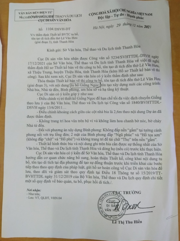 Chưa dừng lại ở đó, ngày 29.12.2021, Cục Di sản văn hóa (Bộ VHTTDL) có văn bản số 1104/DSVH-DT về việc thẩm định thiết kế BVTC (bản vẽ thi công - PV) tu bổ, tôn tạo di tích đền thờ Lê Văn Hưu (giai đoạn 3), gửi Sở VHTTDL tỉnh Thanh Hóa. Tại văn bản này, Cục Di sản văn hóa đã góp ý một cách cụ thể như sau: “Điều chỉnh vị trí thiết kế Giếng Ngọc để hạn chế tối đa việc dịch chuyển giếng theo lưu ý của Bộ VHTTDL tại công văn số 1840/BVHTTDL-DSVH ngày 13.6.2011…”.