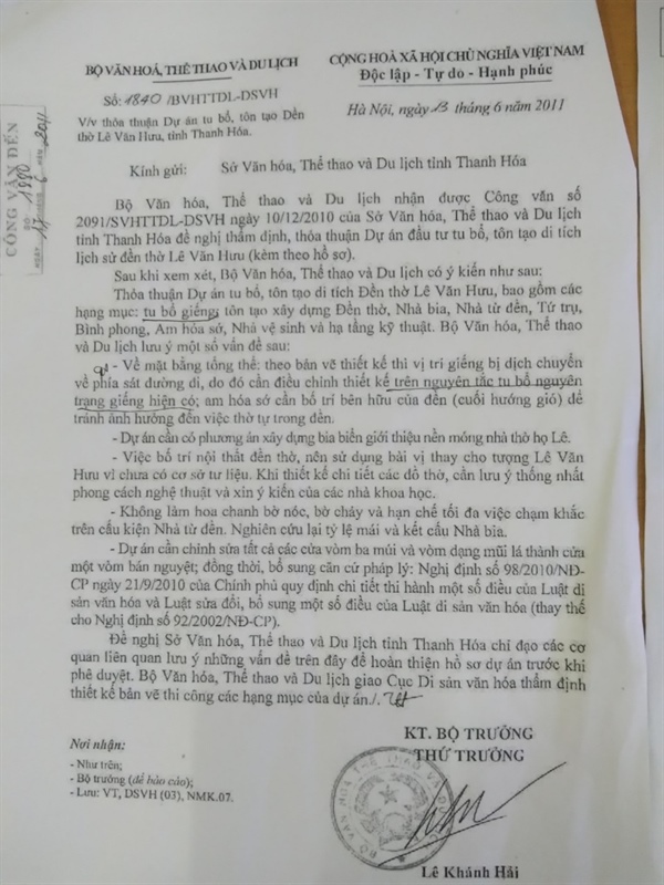 Tuy nhiên, ngày 13.6.2011, Bộ VHTTDL đã có văn bản 1840/BVHTTDL-DSVH về việc thỏa thuận dự án tu bổ, tôn tạo đền thờ Lê Văn Hưu, gửi Sở VHTTDL Thanh Hóa. Văn bản này đã thể hiện rất rõ: “Sau khi xem xét, Bộ VHTTDL có ý kiến: Thỏa thuận dự án tu bổ, tôn tạo di tích đền thờ Lê Văn Hưu, bao gồm các hạng mục: Tu bổ giếng, tôn tạo xây dựng đền thờ, nhà bia, nhà từ đền, tứ trụ, bình phong, am hóa sớ… Bộ VHTTDL lưu ý một số vấn đề như sau: Về mặt bằng tổng thể, theo bản vẽ thiết kế thì vị trí giếng bị dịch chuyển về phía sát đường đi, do đó, cần điều chỉnh thiết kế trên nguyên tắc tu bổ nguyên trạng giếng hiện có…”. Ở cuối văn bản này, Bộ VHTTDL đề nghị Sở VHTTDL Thanh Hóa chỉ đạo các cơ quan liên quan lưu ý những vấn đề trên để hoàn thiện hồ sơ dự án trước khi phê duyệt.