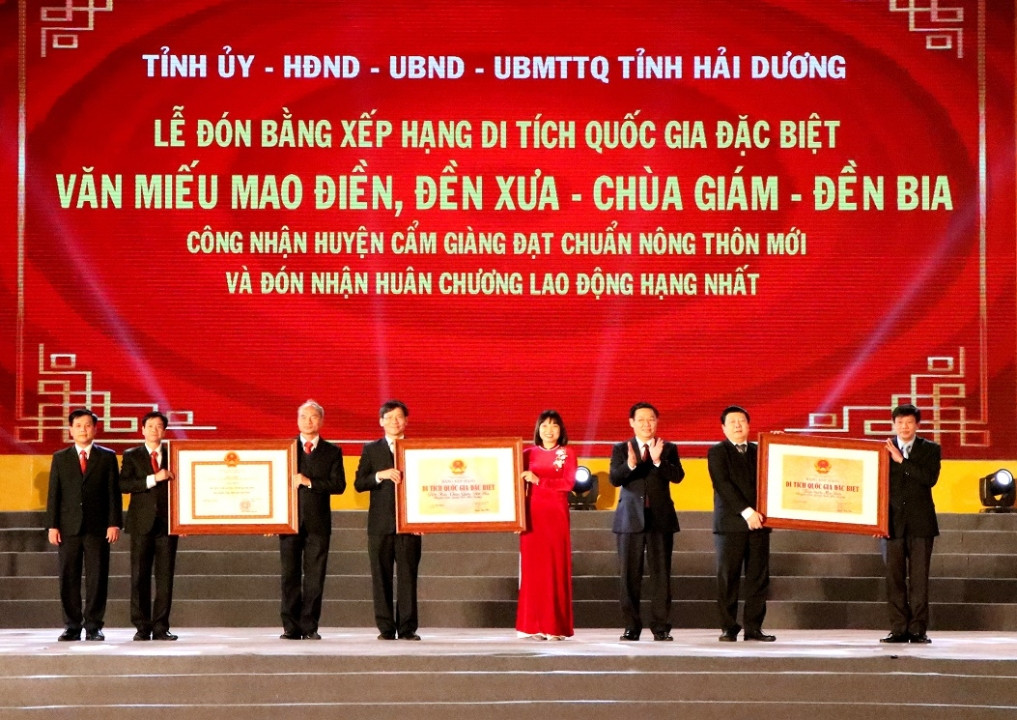 Tại buổi lễ, Phó Thủ tướng Vương Đình Huệ đã trao Bằng xếp hạng Di tích quốc gia đặc biệt Văn miếu Mao Điền, đền Xưa - chùa Giám - đền Bia cho tỉnh Hải Dương; trao Huân chương Lao động hạng nhất, bằng công nhận đạt chuẩn nông thôn mới cho Đảng bộ, chính quyền và nhân dân huyện Cẩm Giàng.
