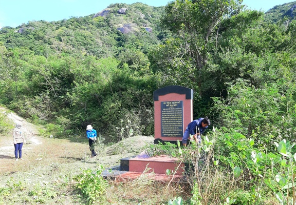 Lực lượng đoàn viên thanh niên địa phương dọn cỏ, phát quang bụi rậm xung quanh khuôn viên bia di tích quốc gia Hố Bà Mùi