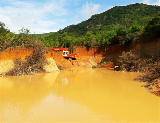 Nơi vị trí lấy đất, giờ đã dừng nhưng để lại một chiếc máy múc với vũng nước tồn đọng lớn