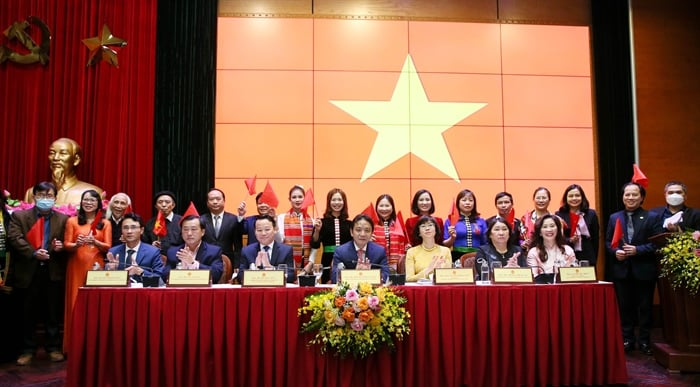 Các lãnh đạo, nghệ nhân chứng kiến giây phút thiêng liêng khi Nghệ thuật Xòe Thái của Việt Nam chính thức được UNESCO ghi danh vào Danh sách Di sản văn hóa phi vật thể đại diện của nhân loại, ảnh: TRẦN HUẤN