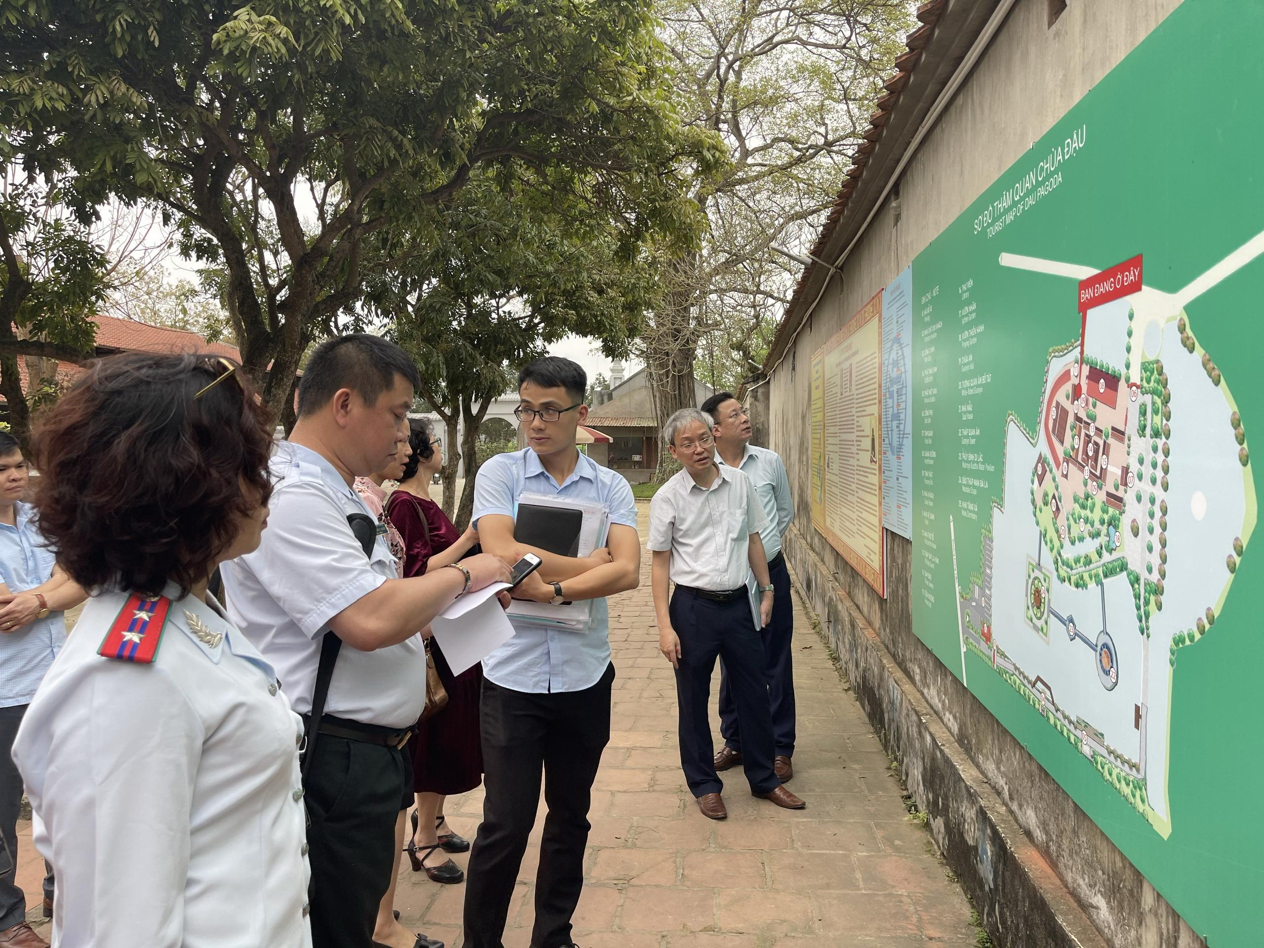 Đoàn kiểm tra của Bộ VHTTDL đối chiếu vị trí các hạng mục công trình trên sơ đồ tham quan tại di tích