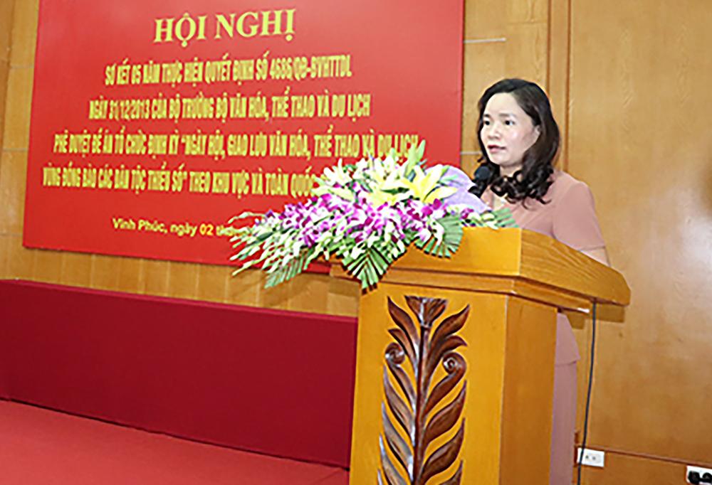 Phát biểu khai mạc Hội nghị, Thứ trưởng Trịnh Thị Thủy nhấn mạnh: Ngày hội, giao lưu văn hóa, thể thao và du lịch vùng đồng bào các dân tộc thiểu số là một hoạt động mang tính xã hội, tính cộng đồng, gắn với đời sống lao động và sinh hoạt của nhân dân đáp ứng nhu cầu, nguyện vọng của nhân dân và yêu cầu, nhiệm vụ chính trị của đất nước. Ngày hội là sự kiện văn hóa quan trọng góp phần tôn vinh giá trị văn hóa của cộng đồng 54 dân tộc Việt Nam, là hoạt động thiết thực nhằm tăng cường khối đại đoàn kết giữa các dân tộc, các địa phương trong cả nước; tuyên truyền, vận động để các dân tộc trong nước hiểu về nhau hơn; giữ gìn, phát huy bản sắc văn hóa và truyền thống tốt đẹp của các dân tộc; thúc đẩy phát triển du lịch nói riêng, phát triển toàn diện về kinh tế - văn hóa – xã hội nói chung.
