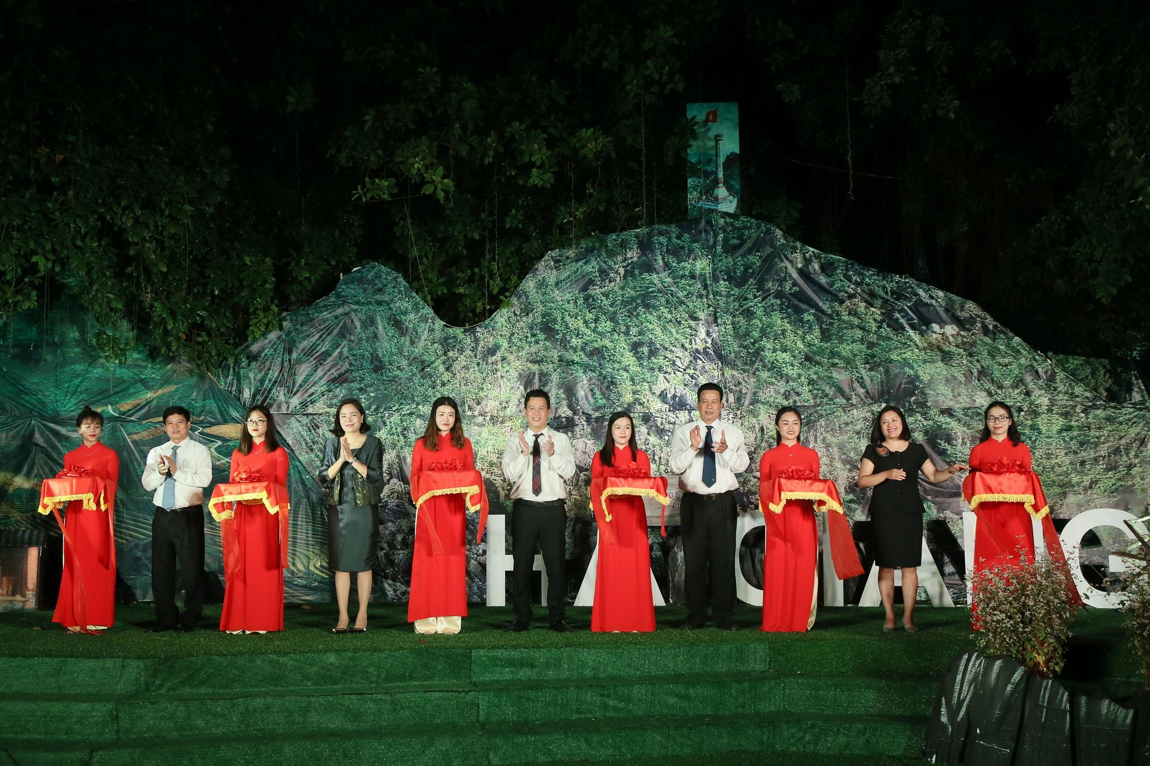 Thứ trưởng Bộ VHTTDL Trịnh Thị Thủy, Bí thư Tỉnh ủy Hà Giang Đặng Quốc Khánh, Chủ tịch UBND tỉnh Nguyễn Văn Sơn cắt băng khai trương Tổng đài Tư vấn du lịch của tỉnh