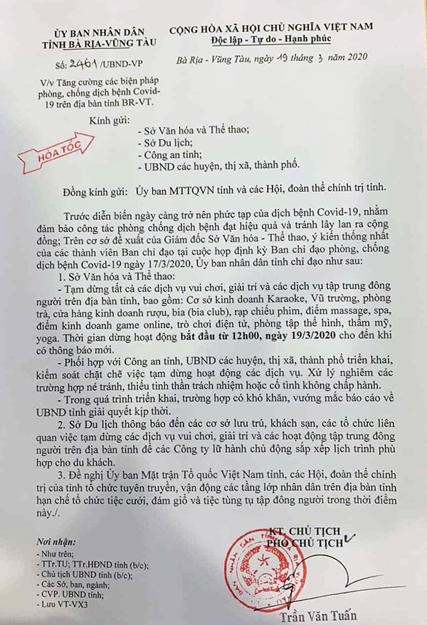 VHO-Ngày 19.3, UBND tỉnh Bà Rịa – Vũng Tàu đã có văn bản hỏa tốc yêu cầu các Sở, ngành liên quan và UBND các huyện, thị xã, thành phố tăng cường các biện pháp phòng, chống dịch bệnh Covid-19 trên địa bàn tỉnh.