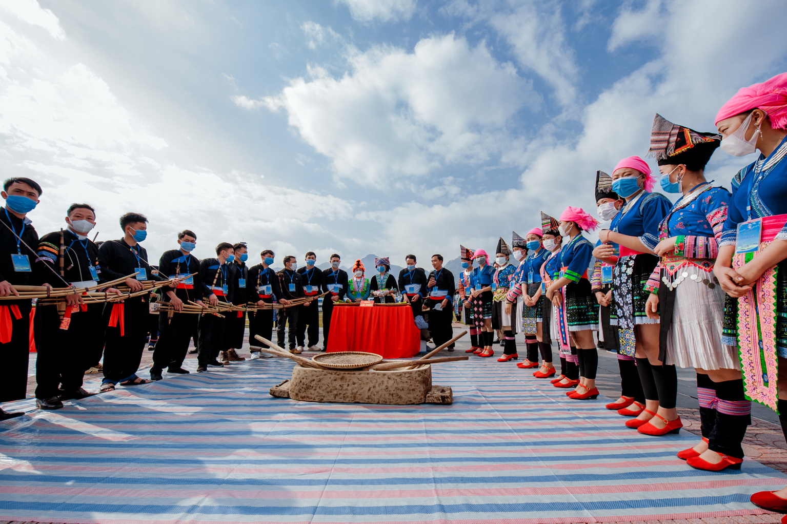 Đồng bào Dân tộc Mông tỉnh Lai Châu trình diễn giã bánh giầy truyền thống
