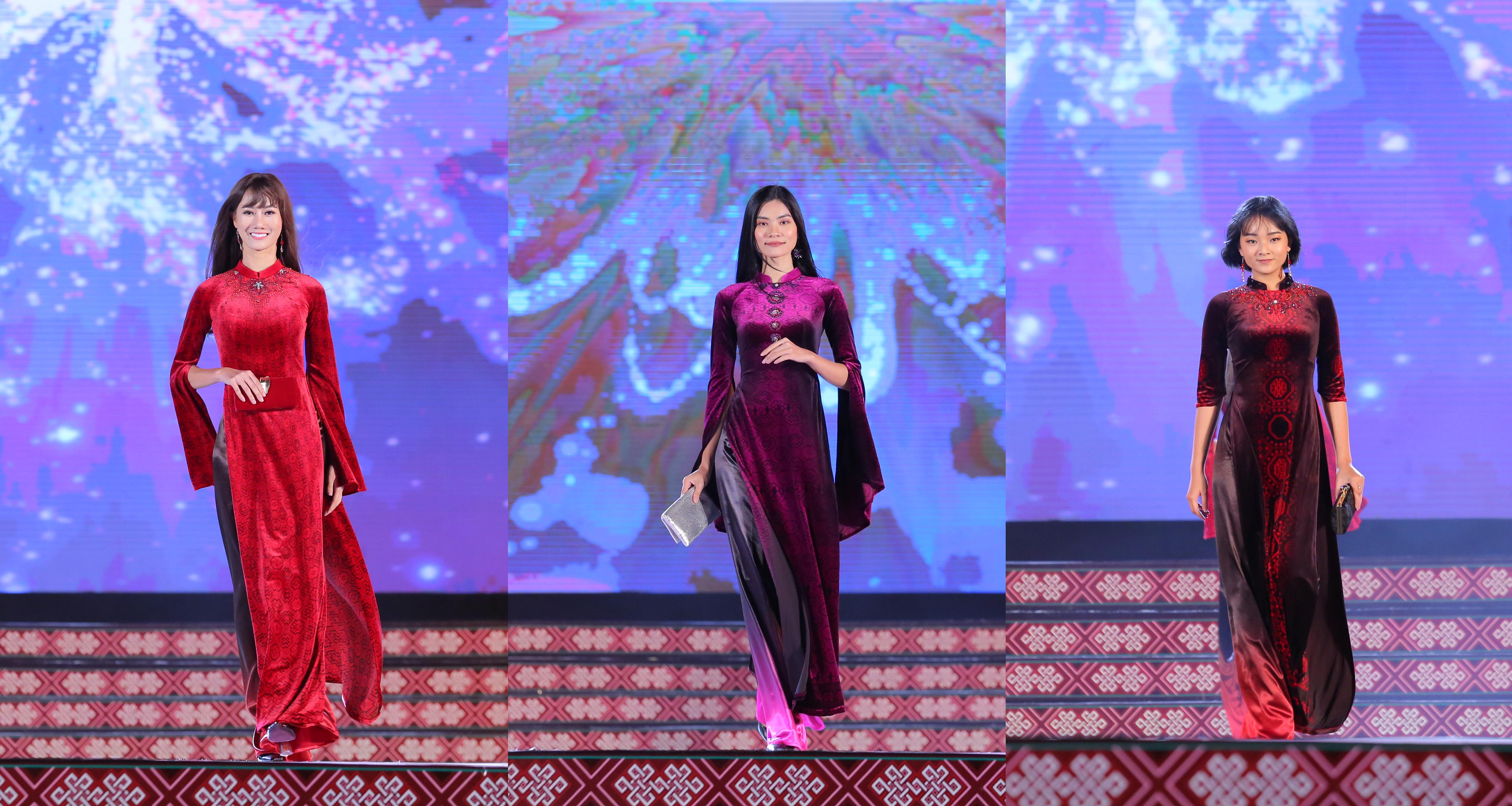Tạo ấn tượng khá đậm nét là bộ sưu tập mang tên "Làng phố" do NTK Đỗ Trịnh Hoài Nam thực hiện, với những mẫu áo được thiết kế từ chất liệu nhung Lyons sang trọng, kết hợp in ấn 3D những hoa văn họa tiết thổ cẩm truyền thống. NTK đã khéo léo kết hợp hoa văn của 3 dân tộc: H'Mông, dân tộc Mạ, dân tộc Tày để làm nên điểm nhấn cho những tà áo dài.