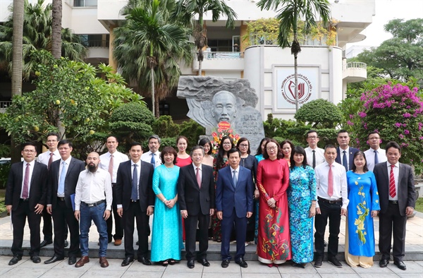 Bộ trưởng Nguyễn Ngọc Thiện và tập thể cán bộ, giảng viên Trường Đại học Văn hóa chụp ảnh lưu niệm tại tượng đài Bác Hồ