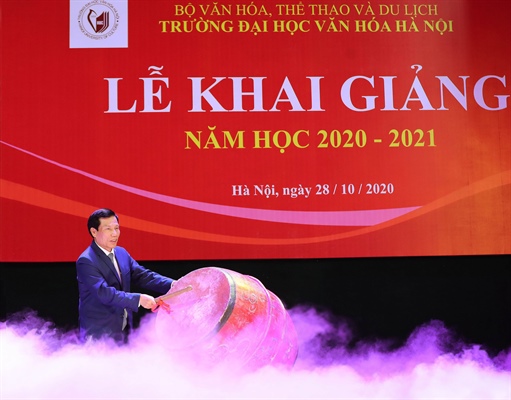 Bộ trưởng Nguyễn Ngọc Thiện đánh trống khai giảng năm học mới Trường Đại học Văn hóa Hà Nội