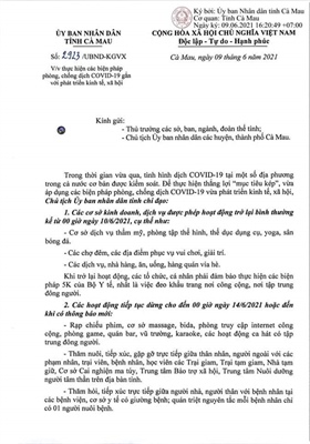 Tuy nhiên, cũng tại công văn này, Chủ tịch UBND tỉnh chỉ đạo một số dịch vụ tiếp tục dừng hoạt động cho đến 0h ngày 14.6.2021 hoặc đến khi có thông báo mới. Cụ thể là các rạp chiếu phim, cơ sở massage, bida, phòng truy cập Internet công cộng, phòng game, quán bar, vũ trường, karaoke, các hoạt động ca hát có tập trung đông người; hoạt động thăm nuôi, tiếp xúc, gặp gỡ trực tiếp giữa thân nhân, người ngoài với các phạm nhân, trại viên, bệnh nhân, học viên các trại giam, trại tạm giam, nhà tạm giữ, cơ sở cai nghiện ma tuý, Trung tâm Bảo trợ xã hội, Trung tâm Nuôi dưỡng người tâm thần trên địa bàn tỉnh. Cùng với đó là các hoạt động thăm hỏi, tiếp xúc trực tiếp giữa người nhà, người thân với bệnh nhân tại các bệnh viện, cơ sở y tế có giường bệnh cũng vẫn phải tạm dừng, quán triệt nguyên tắc mỗi bệnh nhân chỉ có 1 người nuôi bệnh.Ngoài ra, hoạt động vận chuyển hành khách các tuyến cố định bằng đường bộ từ vùng đang có dịch đi và về tỉnh Cà Mau; các hoạt động tôn giáo, tín ngưỡng (theo văn bản chỉ đạo của Ban Tôn giáo Chính phủ) vẫn chưa được phép hoạt động trở lại.
