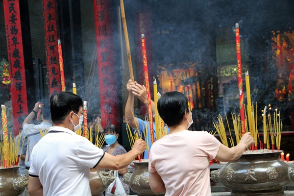 Có mặt tại di tích lịch sử văn hóa quốc gia hội quán Ôn Lăng những ngày qua, chúng tôi nhận thấy lượng khách đến viếng không quá đông. Tương tự, các điểm di tích khác của đồng bào Hoa trên địa bàn như hội quán Nhị Phủ, Nghĩa An, Hà Chương, Tuệ Thành,… lượng khách đến khá vắng. Ở các hội quán này, đều trang bị máy khử khuẩn, đo thân nhiệt cho khách. Người dân đến chùa bắt buộc phải trình chứng nhận đã tiêm chủng đủ liều, thực hiện khai báo y tế trên các ứng dụng hoặc viết tay. Bên cạnh đó, các di tích cũng hạn chế người dân đốt nhang nhiều, mỗi người chỉ được đốt tối đa 3 cây nhang, có hội quán chỉ cho người dân đốt nhang ở phía bên ngoài… nhằm đảm bảo an toàn phòng chống cháy nổ, thực hiện văn minh trong lễ hội…