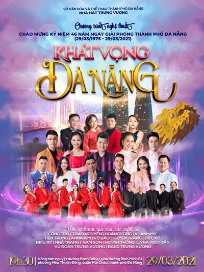 Đặc biệt, chương trình Nghệ thuật đặc sắc Khát vọng Đà Nẵng do các nghệ sĩ Nhà hát Trưng Vương Đà Nẵng sẽ biểu diễn phục vụ khán giả vào lúc 19h30 ngày 29.3. tại Vòng bán nguyệt đường Bạch Đằng giao đường Bình Minh 6, phường Hòa Thuận Đông, quận Hải Châu dự kiến sẽ là chương trình thu hút đông đảo khán giả quần chúng yêu nghệ thuật.