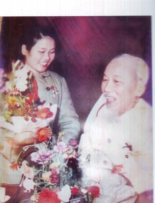 Bác Hồ tặng lại bó hoa tươi thắm cho nữ Anh hùng Nguyễn Thị Kim Huế mà Đại hội vừa tặng Bác tại Đại hội Thi đua toàn miền Bắc các đội TNXP chống Mỹ, cứu nước lần thứ nhất, đầu năm 1967 Ảnh: TƯ LIỆU