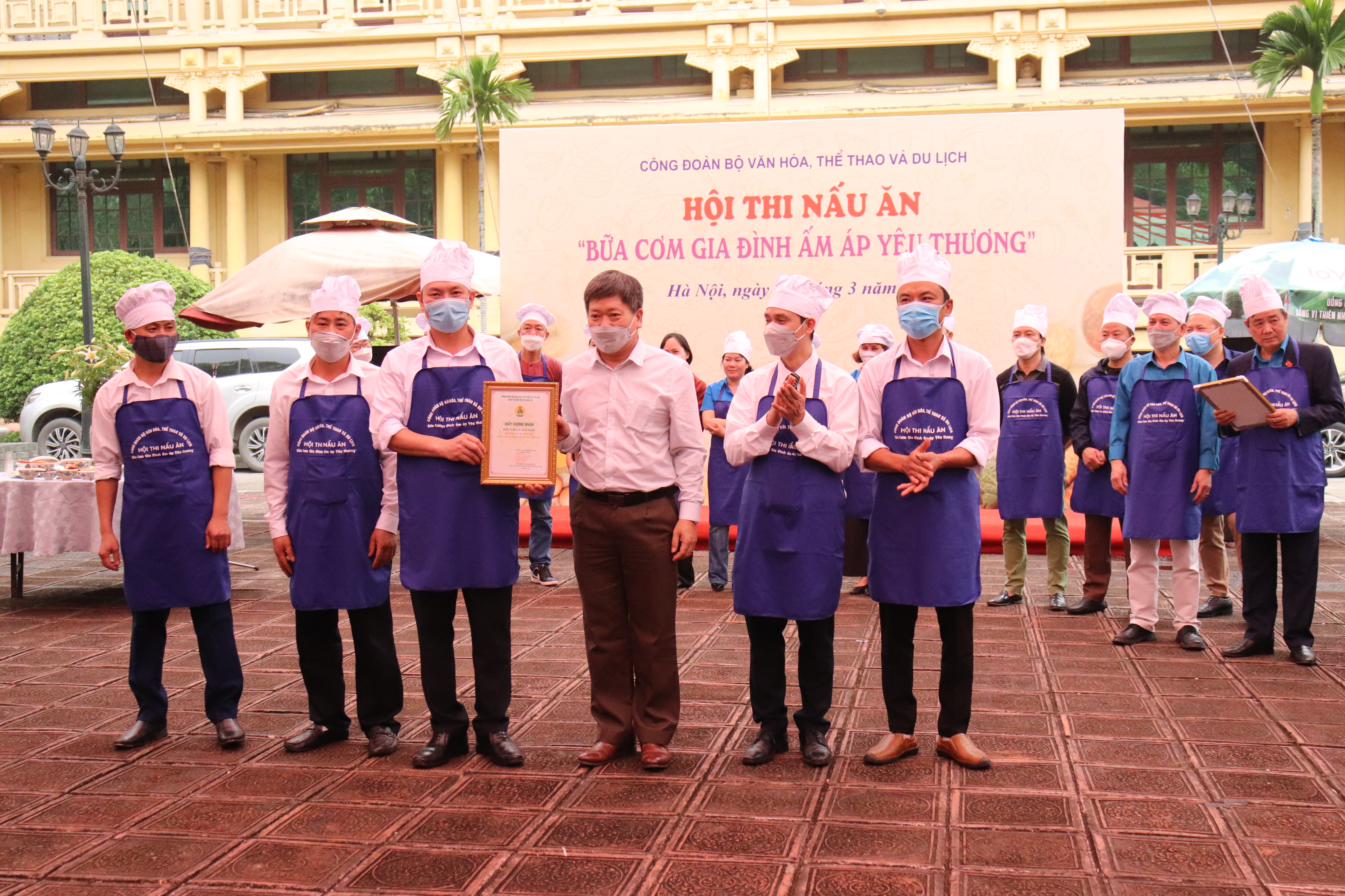 Phó Chủ tịch Phụ trách Công đoàn Bộ VHTTDL Trần Huy Toản trao Giải nhì Hội thi nấu ăn “Bữa cơm gia đình ấm áp yêu thương” cho đội thi của Khối Nghệ thuật biểu diễn