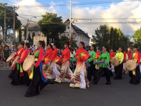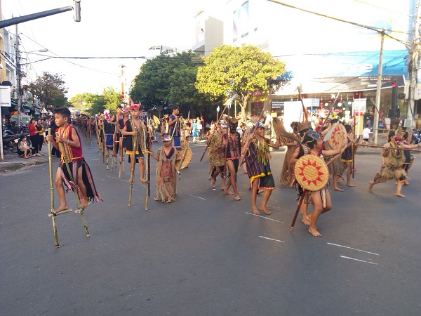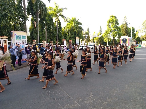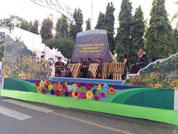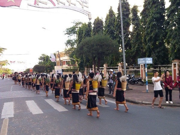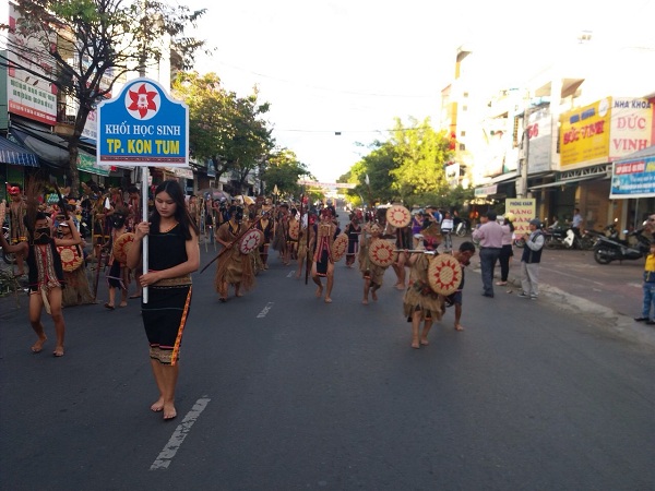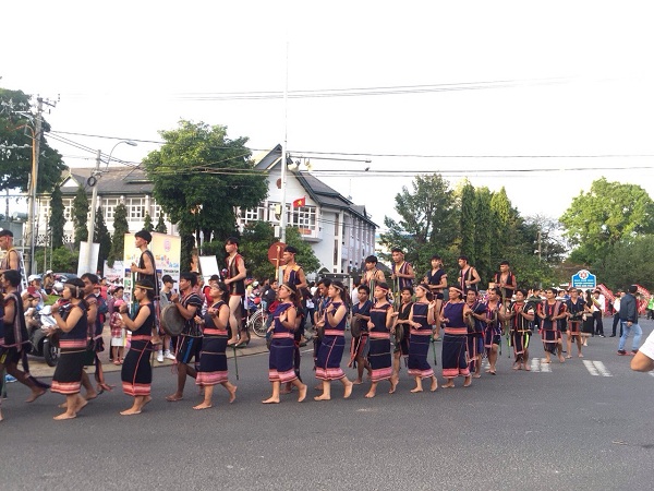 Trong trang phục truyền thống của từng địa phương, hơn 700 nghệ nhân đến từ các tỉnh Đăk Lăk, Đăk Nông, Lâm Đồng, Gia Lai, Quảng Nam, Quảng Ngãi, An Giang và 10 huyện, Tp của tỉnh Kon Tum tham gia diễu hành qua các tuyến phố chính, bắt đầu từ vòng xuyến Bà Triệu - Trần Phú rồi dọc theo tuyến đường Trần Phú về đường Bạch Đằng.