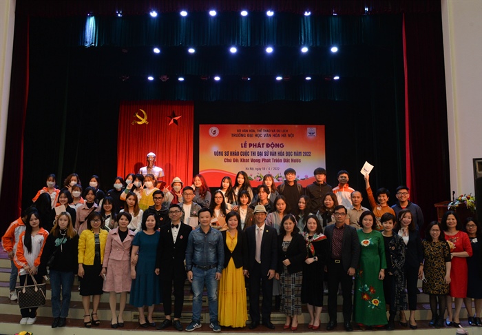 Các đại biểu, lãnh đạo, giảng viên và sinh viên Trường Đại học Văn hóa chụp ảnh lưu niệm tại lễ phát động