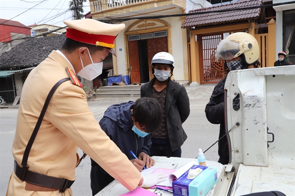 Lực lượng công an xã Khâu Vai kiểm soát phương tiện ra, vào địa bàn