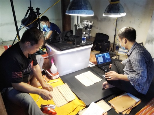 Cán bộ Thư viện Tổng hợp tỉnh Thừa Thiên Huế tiến hành số hóa tài liệu Hán - Nôm tại làng Bao La, xã Quảng Phú