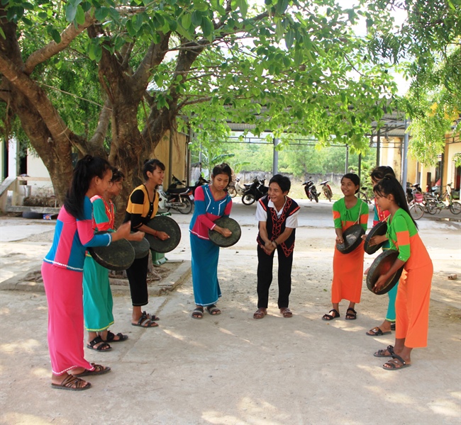 Nghệ nhân Mai Thắm dạy đánh mã la cho các em học sinh Trường PTDTNT Pi Năng Tắc, huyện Bác Ái