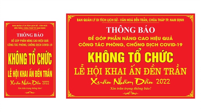 Trước đó, ngày 7.2, BQL Khu di tích đền Trần- Chùa Tháp đã có thông báo về việc không tổ chức lễ hội Khai ấn đền Trần Xuân Nhâm Dần năm 2022. Ngoài ra, BQL thông tin về các nghi lễ truyền thống do Nhà đền thực hiện. Theo đó, ngày 11 tháng Giêng, tổ chức nghi lễ rước kiệu Ngọc Lộ; ngày 12 tháng Giêng, tổ chức nghi lễ rước Nước, tế Cá; ngày 14 tháng Giêng, từ 22h15 đến 22h40 thực hiện nghi lễ dâng hương do nhà đền chủ trì; từ 22h40 đến 23h10 tổ chức nghi lễ rước kiệu ấn do đại diện Hội người cao tuổi, MTTQ và nhân dân phường Lộc Vượng thực hiện (khoảng 20 người tham gia); từ 23h 15 thực hiện nghi lễ khai ấn, giao trưởng từ đền Trần điều hành. Trong thời gian làm lễ khai ấn, đóng cửa đền Thiên Trường để đảm bảo sự tôn nghiêm của nghi lễ truyền thống.