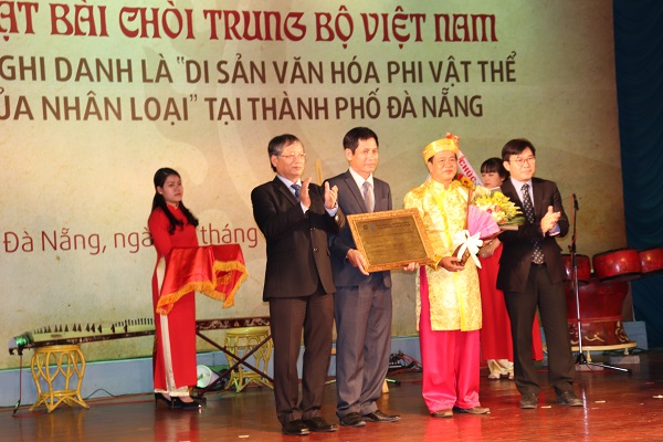 Một sự kiện khác, ngày 7.12.2017 Chủ tịch Ban Chấp hành UNESCO, chủ tọa kỳ họp thứ 12, gõ búa thông qua hồ sơ “Nghệ thuật bài chòi Trung bộ của Việt Nam”, chính thức đưa di sản này vào danh sách Di sản văn hóa phi vật thể đại diện của nhân loại. Đà Nẵng cũng góp phần không nhỏ trong việc bảo tồn, gìn giữ di sản văn hóa phi vật thể này.