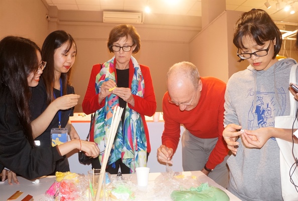 Nghệ nhân Đặng Văn Hậu (thứ 3 từ trái sang) đang giới thiệu tò he