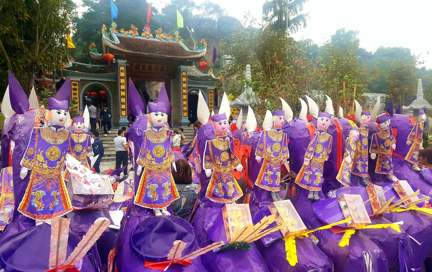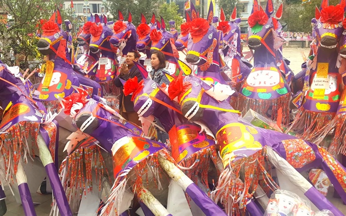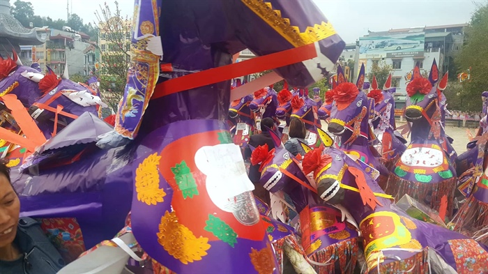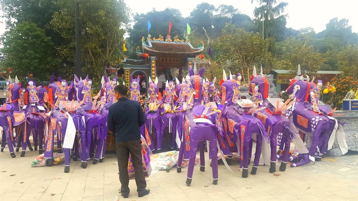 Hàng trăm con ngựa giấy cỡ khủng vây kín ngoài sân và xếp dọc khu vực phía trước và trong đền, đợi đến lượt để vào hóa. Tình trạng này được cho biết không còn là hiếm tại di tích, đặc biệt liên tục diễn ra kể trong những Tết Nguyên Đán vừa qua.
