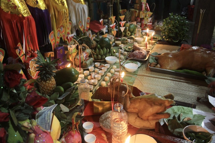 Ngay từ sáng sớm, các thành viên trong gia đình phân công nhau mỗi người một việc để cùng chuẩn bị các vật phẩm dâng lễ. Để làm tốt công tác chuẩn bị thường có thầy phụ lễ hướng dẫn giúp các gia đình. Lễ gồm 3 loại: Lễ tam sinh (gà, lợn quay, vịt...); lễ chay (bánh giày, bánh dợm, bánh ngải), thanh bông hoa quả (hoa, quả chuối).