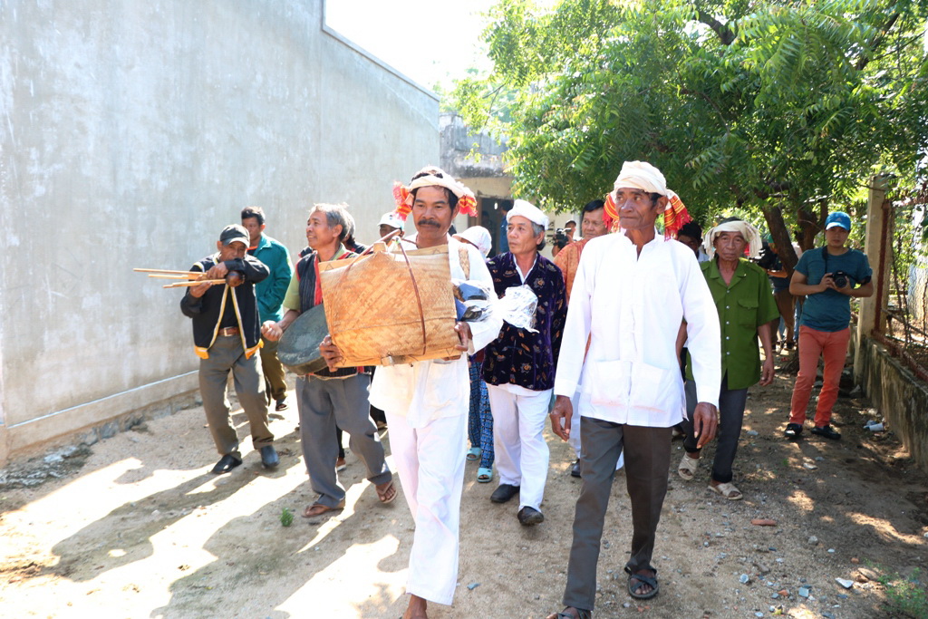 Dẫn đầu đoàn là một tốp khoảng 5 người Raglai vừa đi vừa thổi kèn bầu, đánh mã la, theo sau lần lượt là ông Cả sư, thầy kéo đàn Kanhi, bà Bóng, tiếp theo là những người cầm cờ, đoàn người phụ lễ và dân làng. Sau các nghi thức truyền thống, làng bắt đầu vào phần hội trên sân vận động của làng. Với nền nhạc chủ đạo là các nhạc cụ truyền thống như kèn Saranai, trống Ghinang, trống Paranưng... màn múa hát của nam nữ, với đủ các lứa tuổi, được trình diễn trên khắp mặt sân. Lễ rước y trang là màn khai hội đầy màu sắc dân gian, mang đậm bản sắc truyền thống văn hóa Chăm.