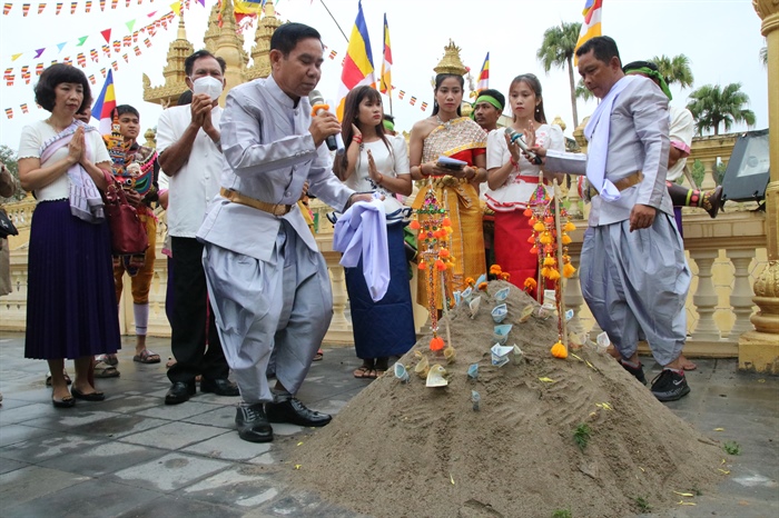 Buổi chiều, tiến hành lễ đắp núi cát, gọi là Puôn - phnum - khsach. Mọi người cùng nhau đắp núi cát để mong muốn tích phúc, an lành cho năm mới. Để đắp núi cát, người ta dùng cát sạch đổ thành đống bên ngoài hành lang trước sân chùa.