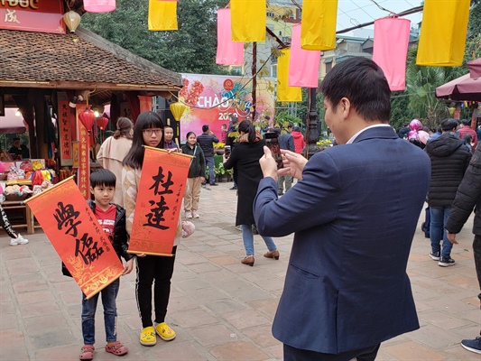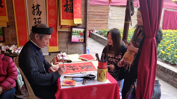 Dù thời tiết có phần giá rét nhưng tại khu vực Hồ Văn vẫn xuất hiện hàng dài người đi xin chữ của ông đồ
