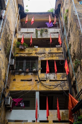Trên nhiều khu tập thể, cờ đỏ sao vàng không nép mình bên trong hành lang mà vươn ra ngoài chào mừng ngày Quốc khánh 2.9