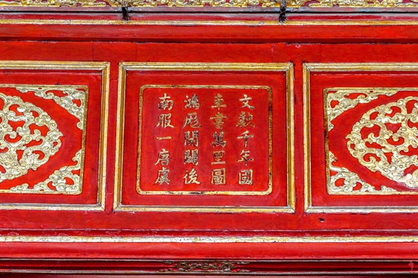 Thơ theo kiểu thức “nhất thi nhất họa” được khắc bằng gỗ sơn son thếp vàng trên liên ba nội thất điện Thái Hòa (Hoàng cung Huế)